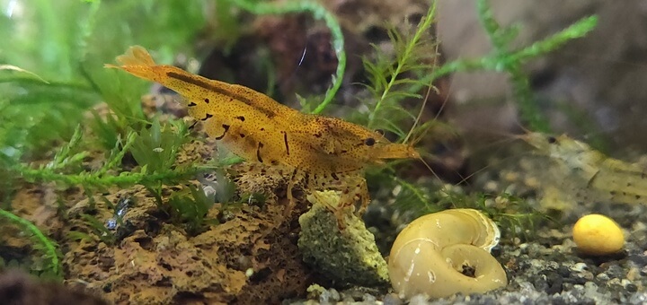 Tangerine Tigers are a natural morph of the Caridina shrimp originating from Taiwan. They have a slightly translucent body with a strong orange or dark yellow tint and a set of dark brown tiger stripes down their back and sides.